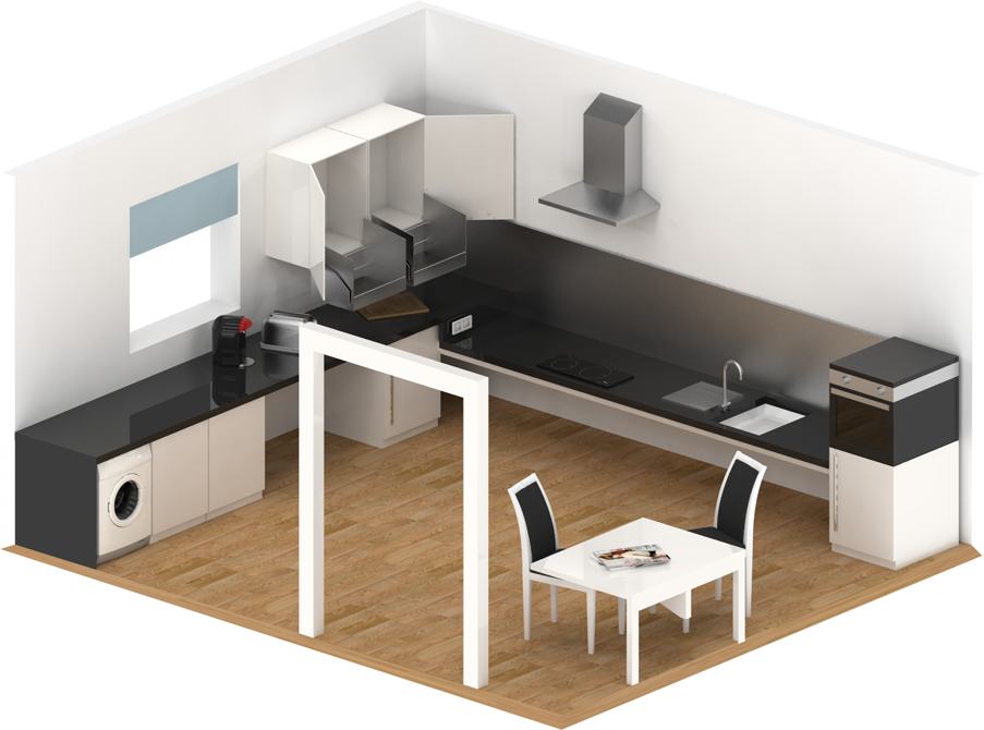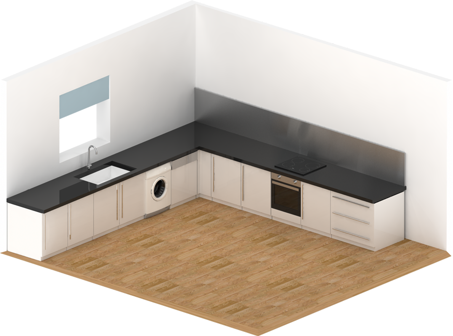 When considering kitchen adaptations, it is important to consider the placement of the fridge, freezer, washing machine and dishwasher. For the purposes of this project this kitchen shows two of the walls and does not illustrate the placement of a dishwasher or freezer.